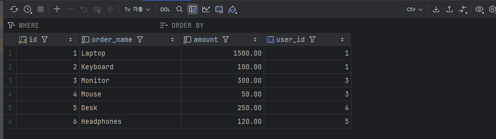 ## join 주문 내영중에서 사용자 이름이 Kim인 내역만 조회