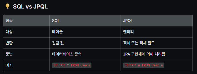 JPQL은 Entity 객체를 대상으로 쿼리를 작성하는 갱체 지향 SQL 입니다.