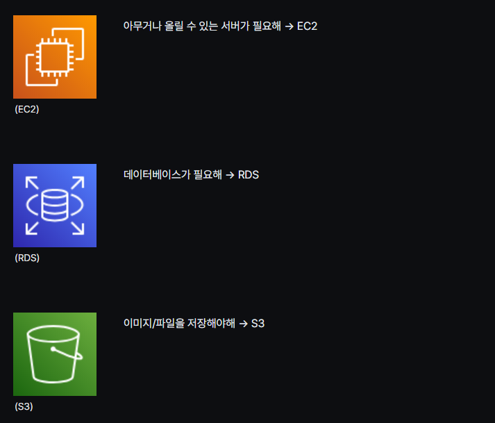 당장 EC2,RDS,S3를 아는 것이 중요한게 아니라, 특정 니즈가 있을 때 그 니즈를 충족시킬 AWS 서비스를 찾아서 사용하면 됩니다. 수많은 AWS 서비스를 억지로 외우지 맙시다 우리! 내 상황에 필요한 도구를 찾아 쓰다 보면 자연스럽게 내 것이 됩니다.