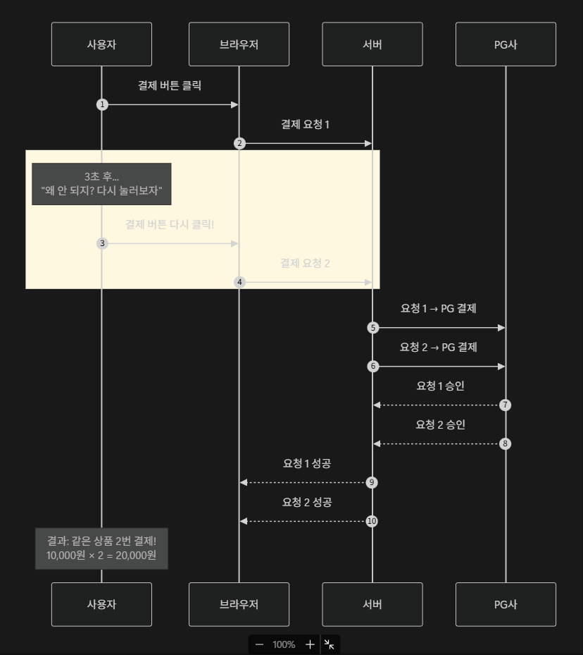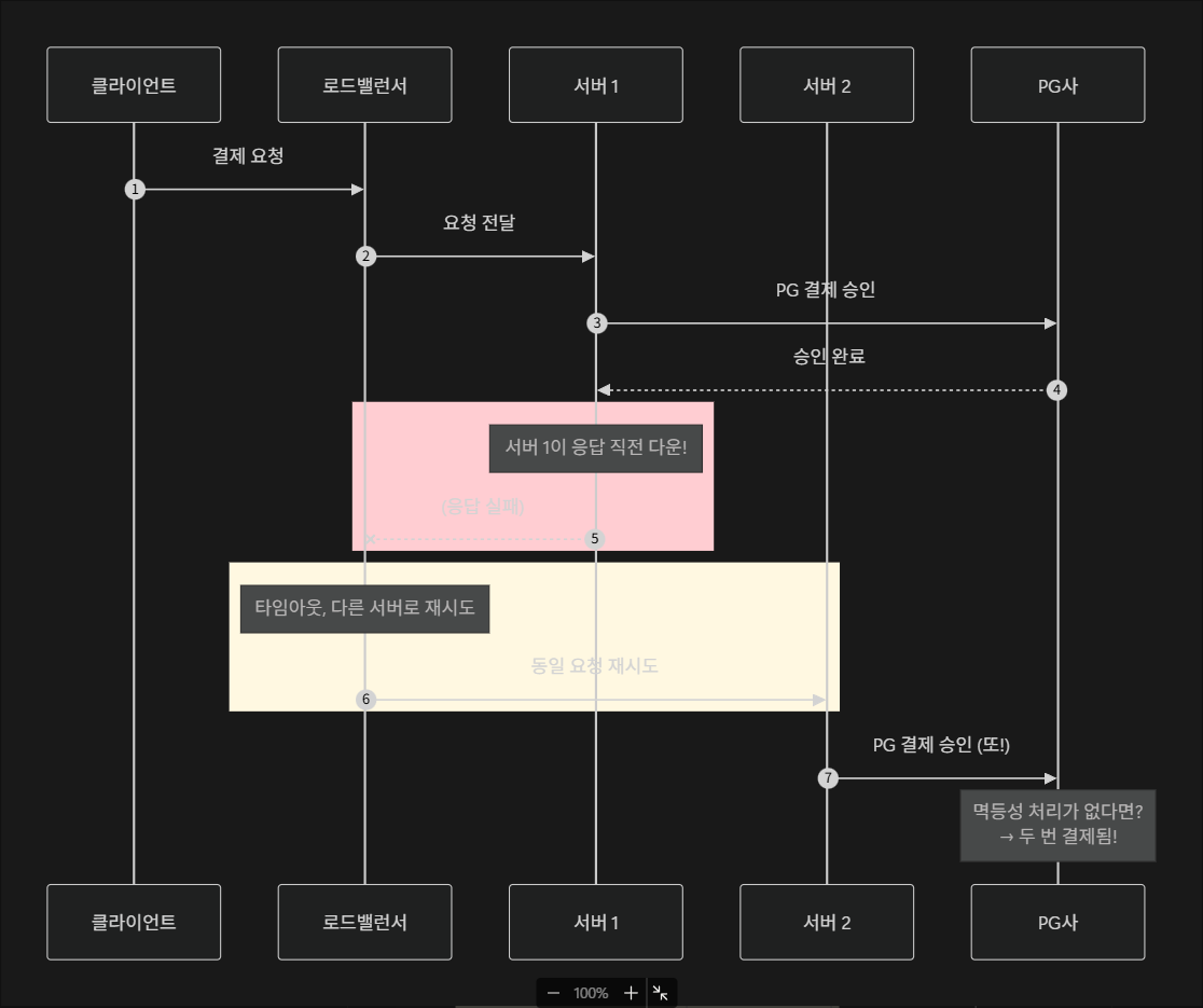 분산 시스템에서는 네크워크 불안정, 타임아웃, 재시도 등의 이유로 같은 요청이 여러 번 도달할 수 있습니다.