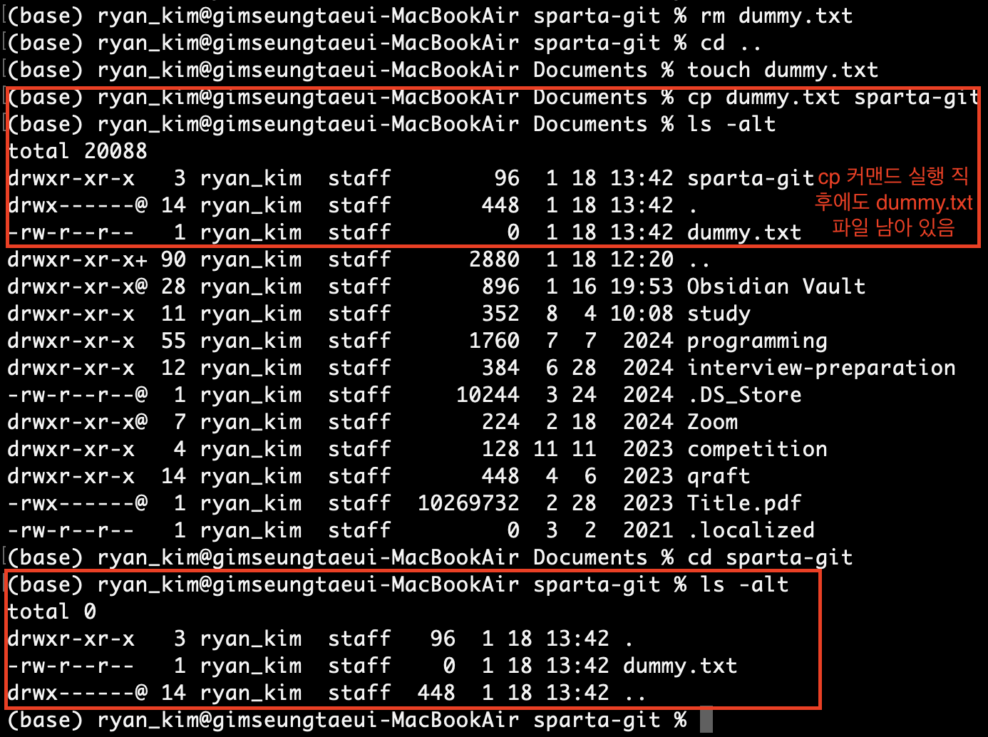 참고로 이미지 상에서 cd .. 을 수행한 것은 생성한 sparta-git 의 상위