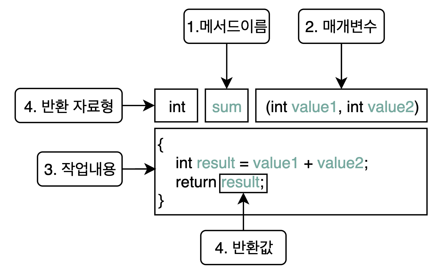 int sum(int value1, value2) { // ✅ 메서드 선언된 곳